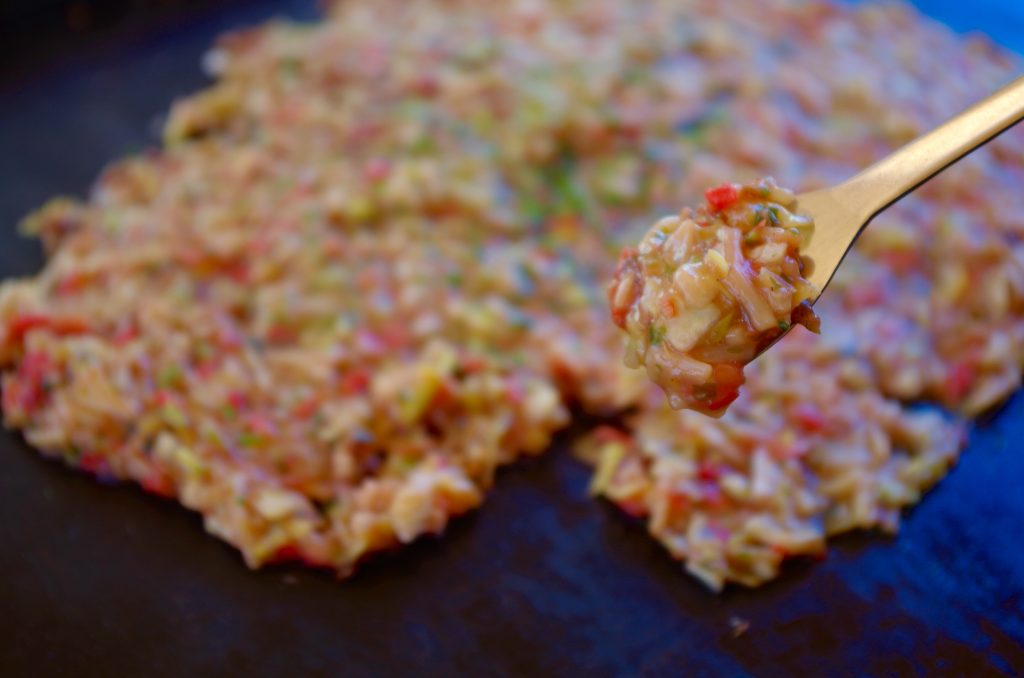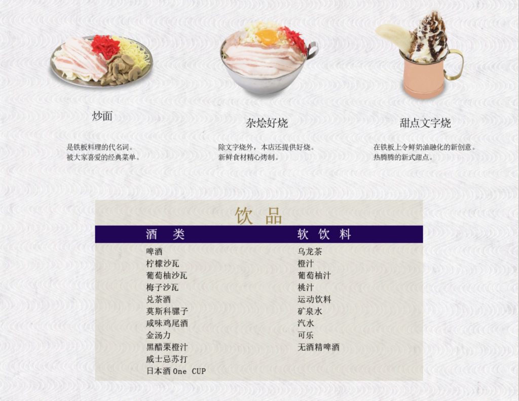 一般人大概比較熟悉御好燒(大阪燒),但可能不太熟悉文字燒?在這裡特別說明一下文字燒。文字燒,日文「もんじゃ焼き」早期是小孩子的零食,起源於東京,是將肉、海鮮、蔬菜等食材,加入稀釋的麵糊中,放在鐵板上煎考,煎烤過程外圍焦脆鍋巴跟餡料濃稠的口感有種說不出的美味。而且一定要用小鏟子吃。