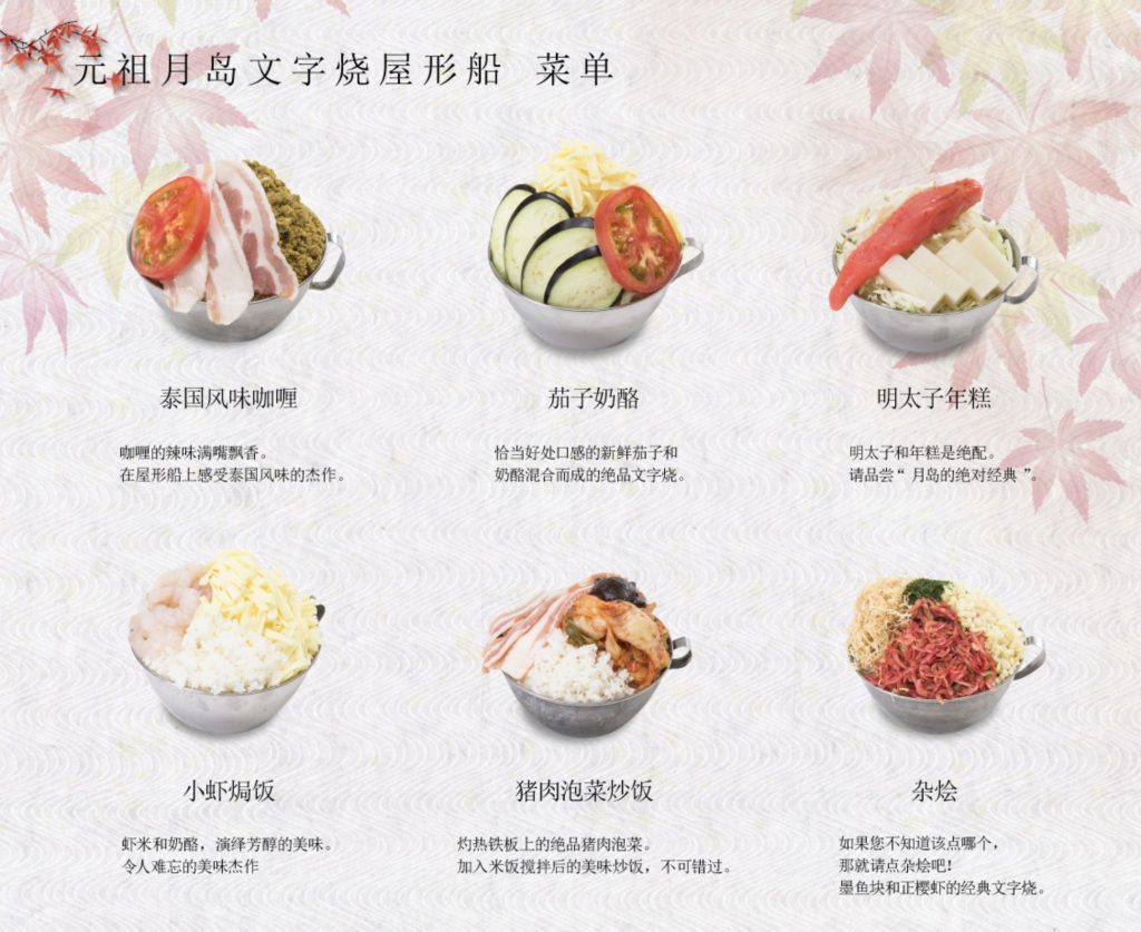 主要提供多樣口味的文字燒,但如果吃膩了也有御好燒(大阪燒)、炒飯、炒麵以及小香腸等多樣菜色選擇,乘船的兩個小時期間都可以無限享用。