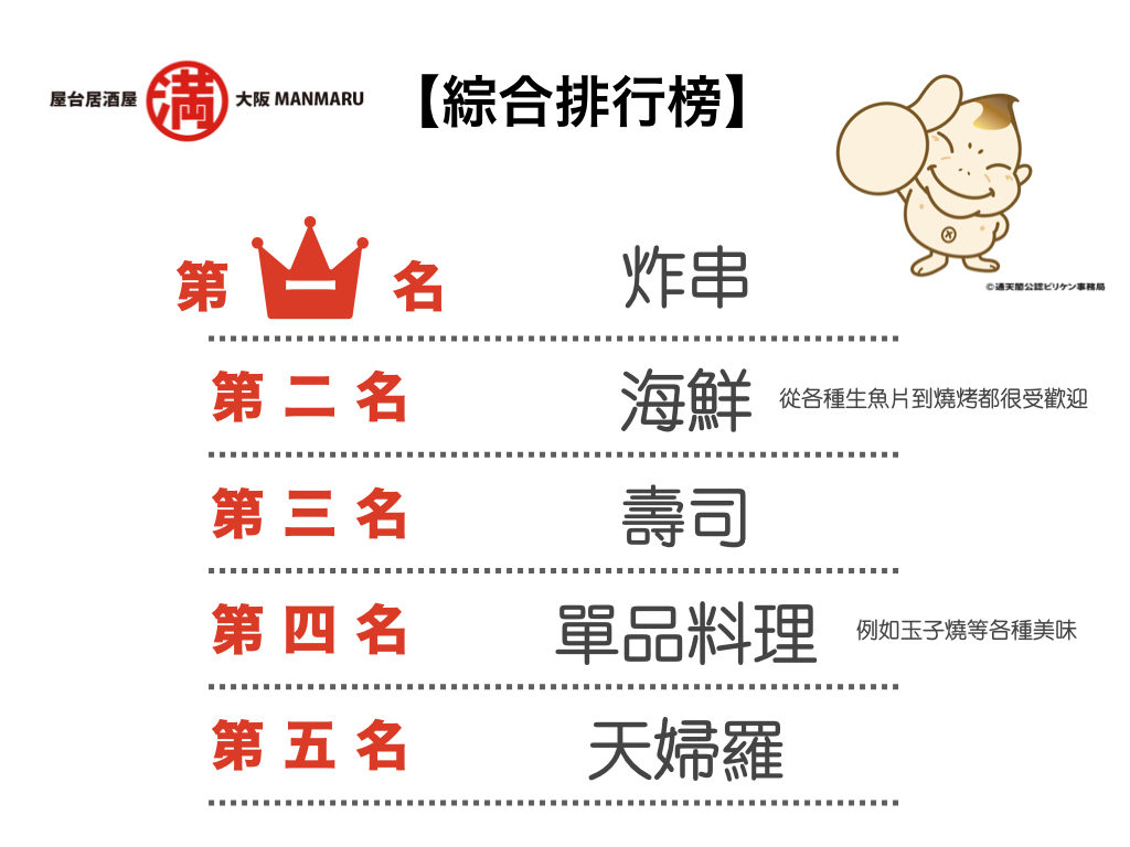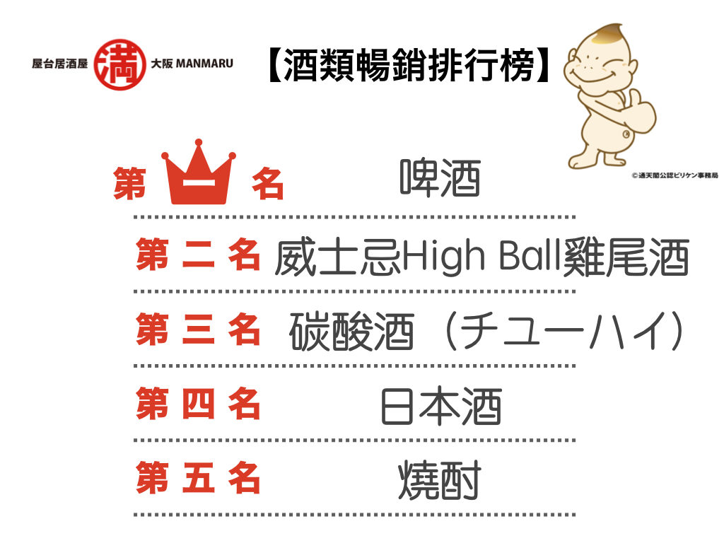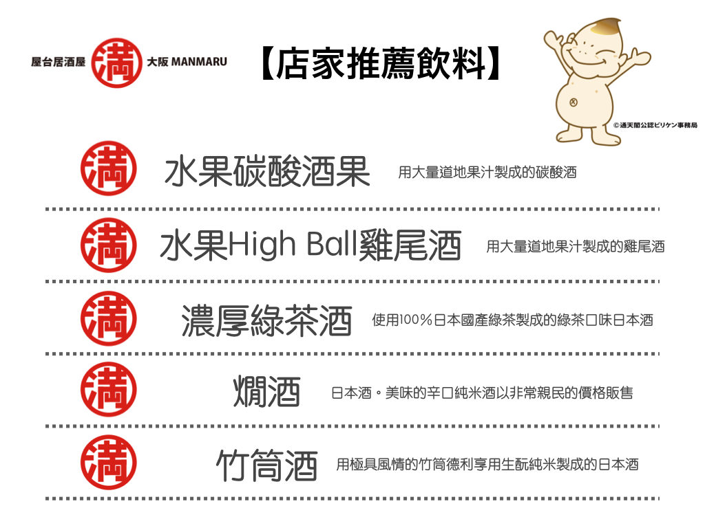 「JANJAN橫丁」內有一間CP值超高,連在地人老饕都非常推薦的大阪美食餐廳,叫做「滿丸」(満マル)。「滿丸」是一間居酒屋,更是一間大眾食堂,菜單品項多、用料品質高,並且價格親民,是其最大特徵。