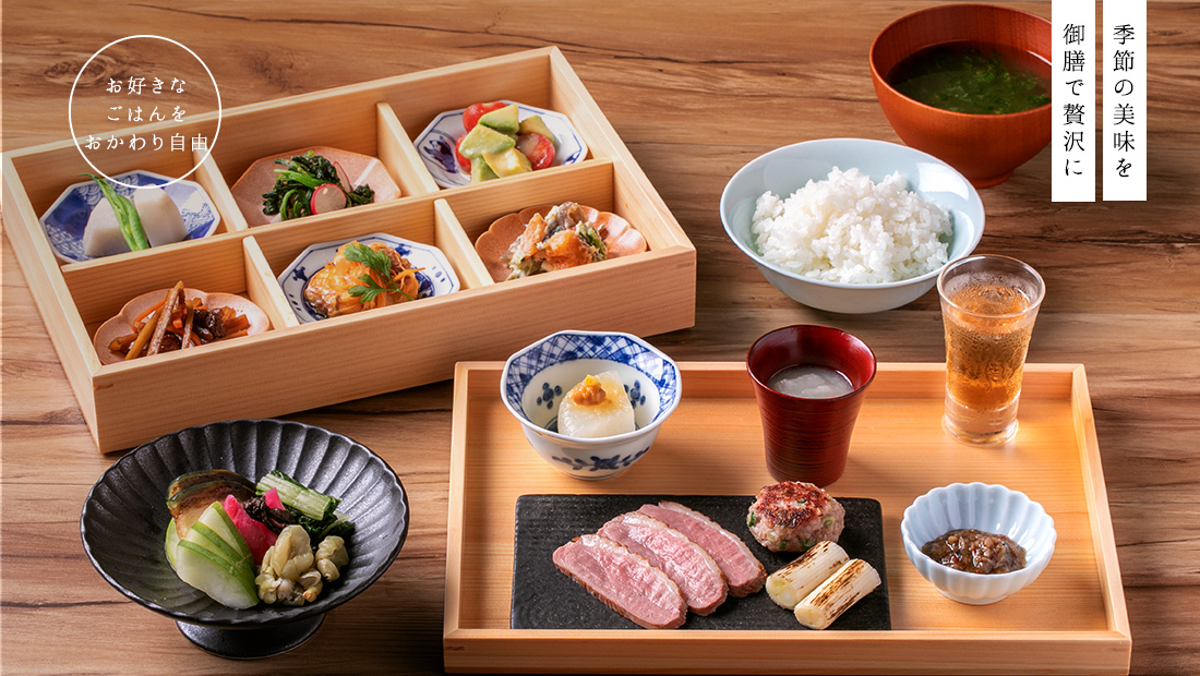 一般的定食,只能選擇一款米飯搭配,午餐限定的「象印御膳」則可選擇兩款不同的米飯嘗試比較,搭配自選主菜與4種下飯的配菜,分量充足且營養均衡。晚間套餐更加豐富,除了美味的米飯及主配菜外,還搭配餐前酒及甜點飲料。還有由料理家吉田麻子特製的「今宵的晚餐」限量套餐提供選擇。(詳細菜單請見)