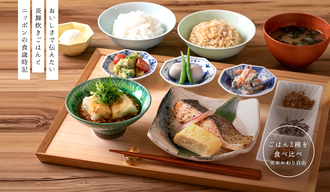 定食內搭配的飯每天都有三種選擇,第一款是象印推薦煮法的白飯,第二款是更富有黏性的白飯,第三款則是更健康的「玄米」、「金賞健康米」、「金色IBUKI」的其中一款隨機出現,不管是哪一種都是可以自由追加。