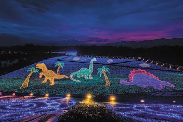 福井縣的「GEO ILLUMINATION」則是北陸地區最大級燈飾。以太古與恐龍世界為主題,以現代光影技術呈現46億年前地球誕生時至動植物出現的時代,再到恐龍生存的中生代景象。
