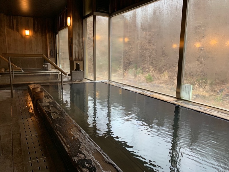 溫泉部分的室內浴池,男湯女湯各有三個浴槽,分別是天然溫泉、礦物質溫浴和寢湯。比起同樣位於群馬的草津溫泉來說,藥師溫泉的泉質感覺對皮膚較為溫和,而且不那麼燙,得以悠緩地一邊泡湯,一邊遠望整片山景。