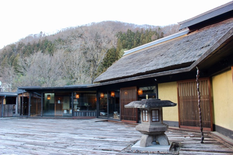 光是站在旅籠溫泉旅館的入口,就會感到被其特殊且氣派的大門給震懾了。本來已經是夠隱秘的山間了,而這座茅草建材架構的傳統長屋門,一進一出,更像是隔絕出一座世外桃源。