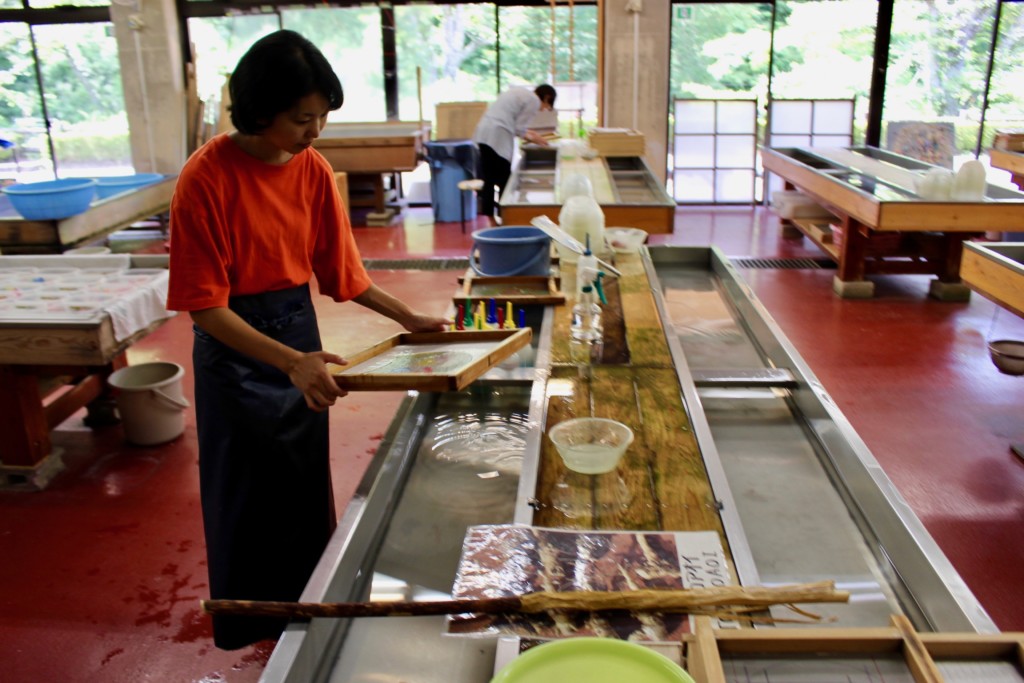 小原和紙的特色之一,是將經過染色的植物纖維,替代繪畫所需的顏料,在一邊漉紙的過程中,一邊將和紙上色,進行圖案的繪製。
