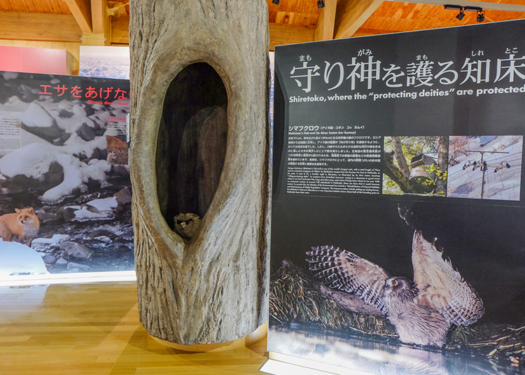 「知床世界遺產中心」也位於宇登呂地區的街道上,館內的規劃設計猶如一座充滿了大自然氣息的小木屋,有許多知床地區的地理資訊、動植物的生態展示說明,除了文字與影像的知識傳遞之外,館內可互動的設施也非常多,可以用聆聽、觸摸、遊戲…等各種方式來學習了解知床寶貴的自然生態世界,對於來館參觀的大人、小朋友們可說是達到了寓教於樂的實質效果。