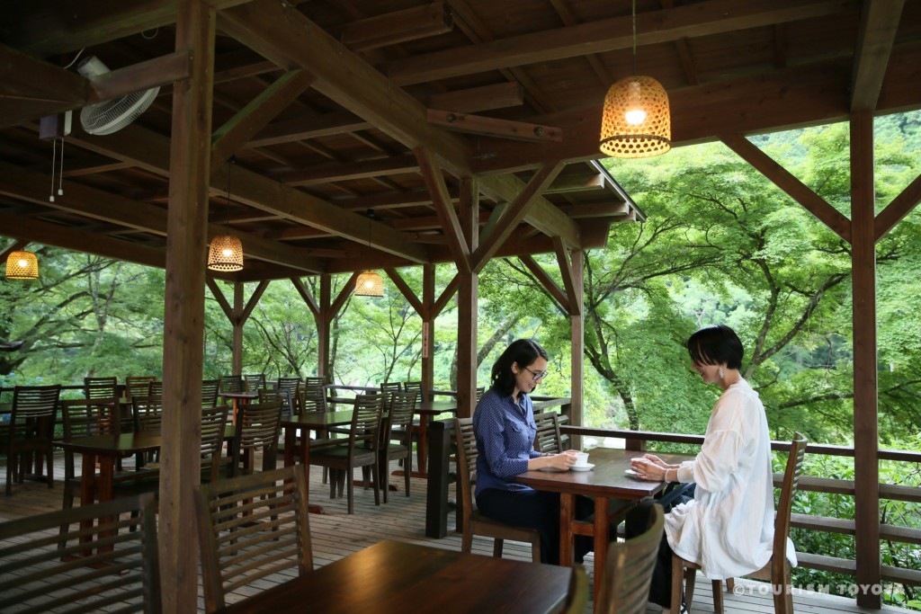 在餐飲店「檜茶屋」內,可以吃到手工製作的五平餅和鹽味烤香魚,另外也有烏龍麵及蕎麥麵。五平餅和鹽味烤香魚以炭火燒烤, 呈現豐美可口的絕佳美味。
