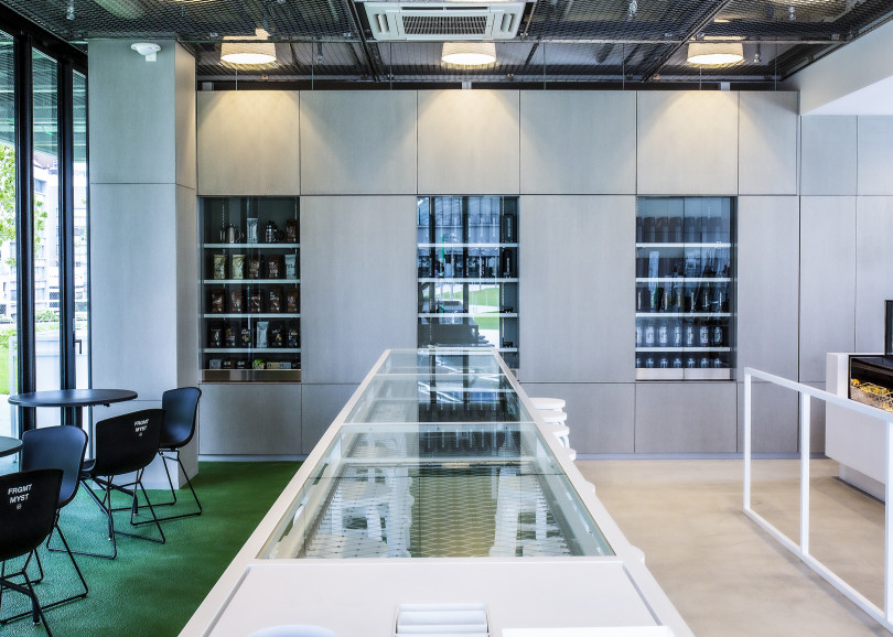 建築的設計概念來自於國外的路邊加油站,充滿開闊的公路感。地板的綠色設計和吊頂的結構上,採用了與設施相同的網狀結構。之所以有這樣的設計理念,是因為這是屋頂公園唯一的一家店,在長約330公尺的步道中,藤原浩聯想到了在海外長路上的路邊加油站。
