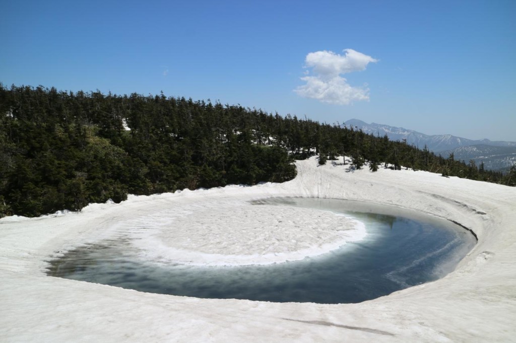 八幡平龍之眼(八幡平ドラゴンアイ)位於八幡平,正式名稱是「鏡沼」。每當冬春時節,大量融化的積雪流入沼澤地,到了春天,沼澤地的中心會在浮力的作用下被抬高。隨著天氣的變暖,中間的雪開始融化,就形成了所謂的「龍眼」之特殊景觀。藍色的水面與白色的雪看起來彷彿就像龍的眼睛一般,因此被稱為「八幡平龍之眼」。出現的期間短暫,受天候影響也不容易看到,所以要是能見到,那麼你必定是非常幸運的人!