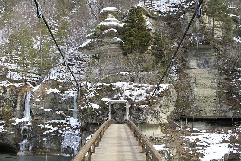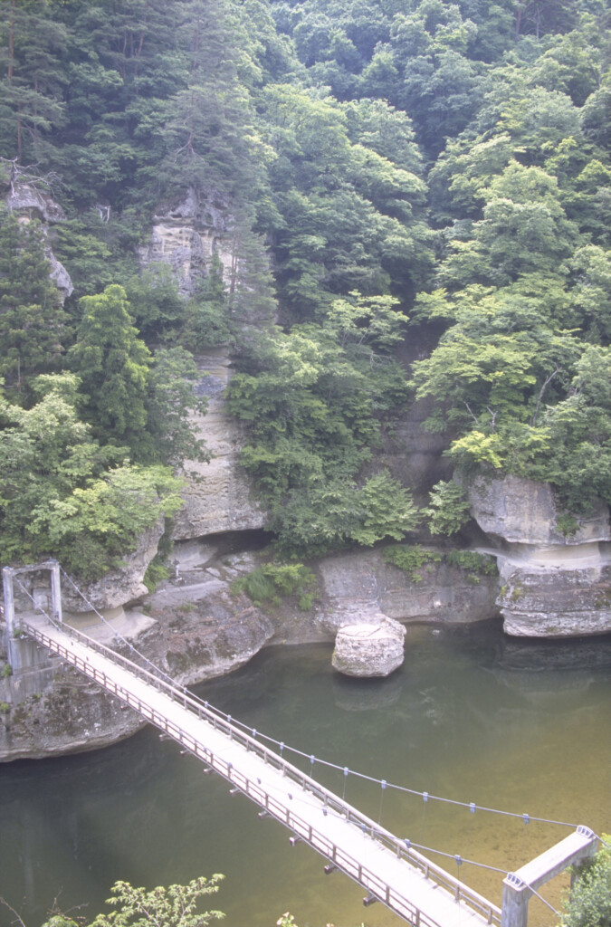 「塔崖」的日文「へつり」在會津地區的方言中意思是「危險的懸崖」,中文通譯為「塔崖」。這個地方的地形相當特別,受到百萬年的侵蝕和風化,形成像是塔一樣突出的奇形怪時,入選為國家天然紀念物。石頭有各自的名稱,像是屏風岩、象塔岩、獅子塔岩等。夏天可以欣賞紫藤花,秋天則是紅葉,景色迷人。走過吊橋,更能近距離觀賞懸崖,從吊橋上俯瞰景色也令人難忘。附近有餐廳和紀念品店。