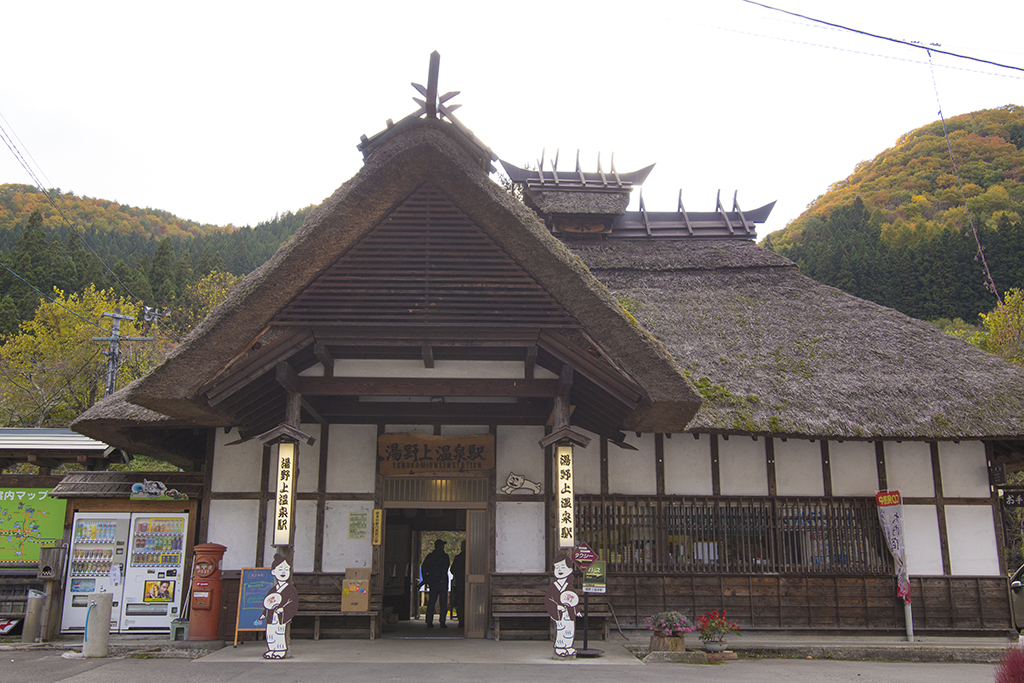 會津車站是日本唯一的茅草屋頂車站,建築本身非常優美典雅。候車室裡設置圍爐,可以坐在這裡暖身喝茶等候電車進站,十分日本風情的體驗,特別吸引外國旅人。車站旁邊有一個足湯 「親子地藏之湯」,可以在這裡休息和泡腳。每逢春天,鐵路兩旁開滿櫻花,搖身一變成為賞櫻勝地。不僅春天的車站美,夏天也是美不勝收,到了秋天,車站周圍漫山遍野的秋葉,而冬天則是大雪紛飛的美景。