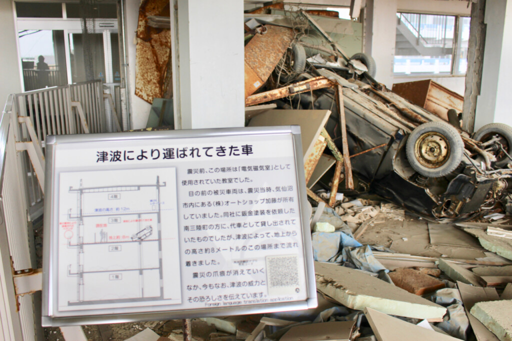 震災的海嘯當時在這裡高達12公尺,衝到教室的四樓,如今參觀到三樓時,還能見到被海嘯從地面捲起來的汽車被卡在這裡。海嘯力道的恐怖,難以置信。
