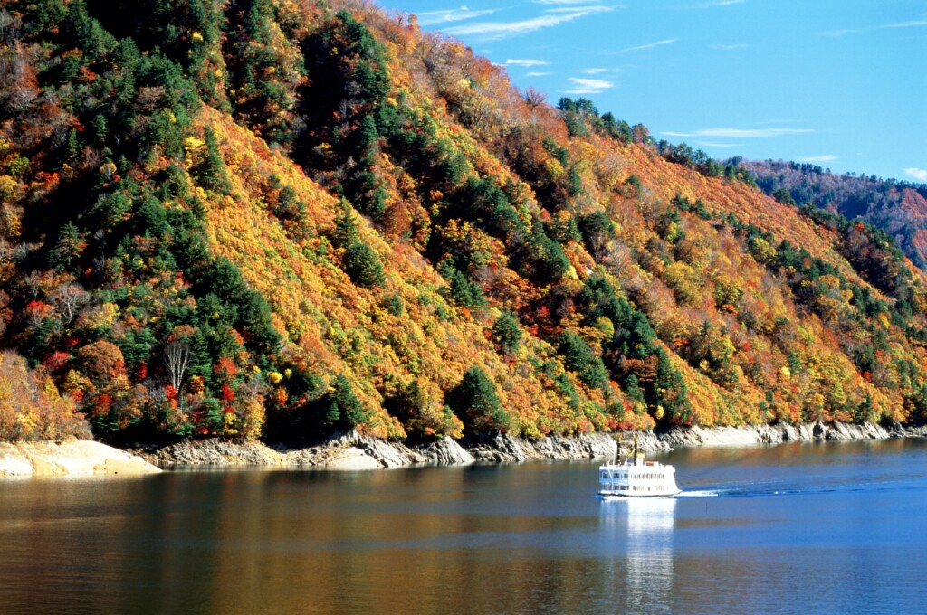 奥只見湖是日本最大的人工湖之一,在1960年由J-POWER電力發展有限公司完成,儲水量超過6億噸。因為在江戶時代,這裡曾開採過白銀,所以也被稱為 「銀山湖」。這裡是新瀉縣的賞紅葉景點之一,被選為日本100個最佳紅葉觀賞地。每逢紅葉季節,可以在此欣賞到五顏六色的紅葉,如原始山毛櫸林的黃葉和茶葉,以及楓樹家族的紅色、深紅色、紫色和朱紅色。最推薦沿著奥只見大壩來一趟周遊路線。
