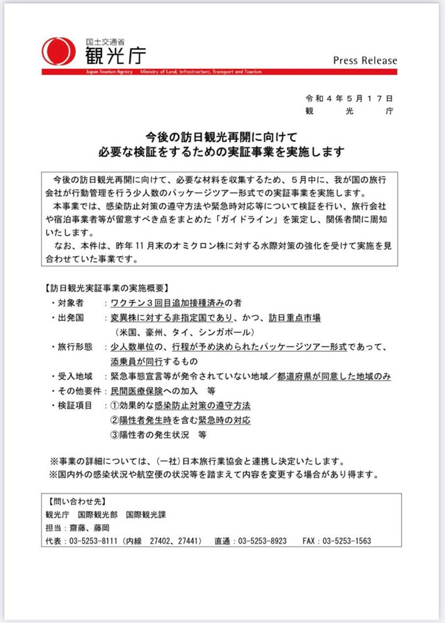 日本宣布率先開放四個國家(美國、澳洲、泰國、新加坡)少人數旅行團入境日本旅遊,在今天5月24日正式開跑。首先是來自美國的7名觀光客,在24日晚間抵達成田機場。7人將分成2組參觀日光東照宮、白川鄉等景點,團員必須完整接種三劑疫苗,同時旅行社必須提交旅遊行程,團員不能脫團,必須有導遊陪同。旅行團所去的地點,事先已經過當地政府的同意。在這7人之外,預計這個月還有約50人會入境日本旅行。