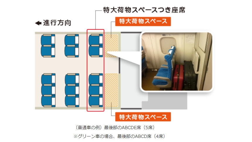 現在搭乘JR東海、JR西日本、JR九州新幹線,如果你要攜帶超過登機箱大小的大件行李,就必須在預約新幹線指定席車票時,一併預約「攜帶特大行李」才行(免費),這樣你才有放大行李的地方,否則搭車時你將被收取額外的日幣1000圓,而且可能還會被要求更改預約車票的內容喔!
