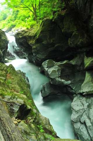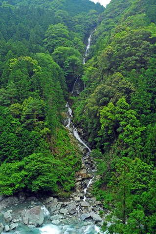 鳴瀑布距離土釜瀑布不遠,這裡有大量的瀑布泉水,從標高一千多公尺的山谷源頭,分為三段直衝傾洩而下,落差達到約85公尺,是德島縣最大落差的瀑布。除了從438號國道可以看到整條瀑布之外,也可以到第一二段中的展望台,近距離欣賞瀑布,看著水花飛濺極為療癒。