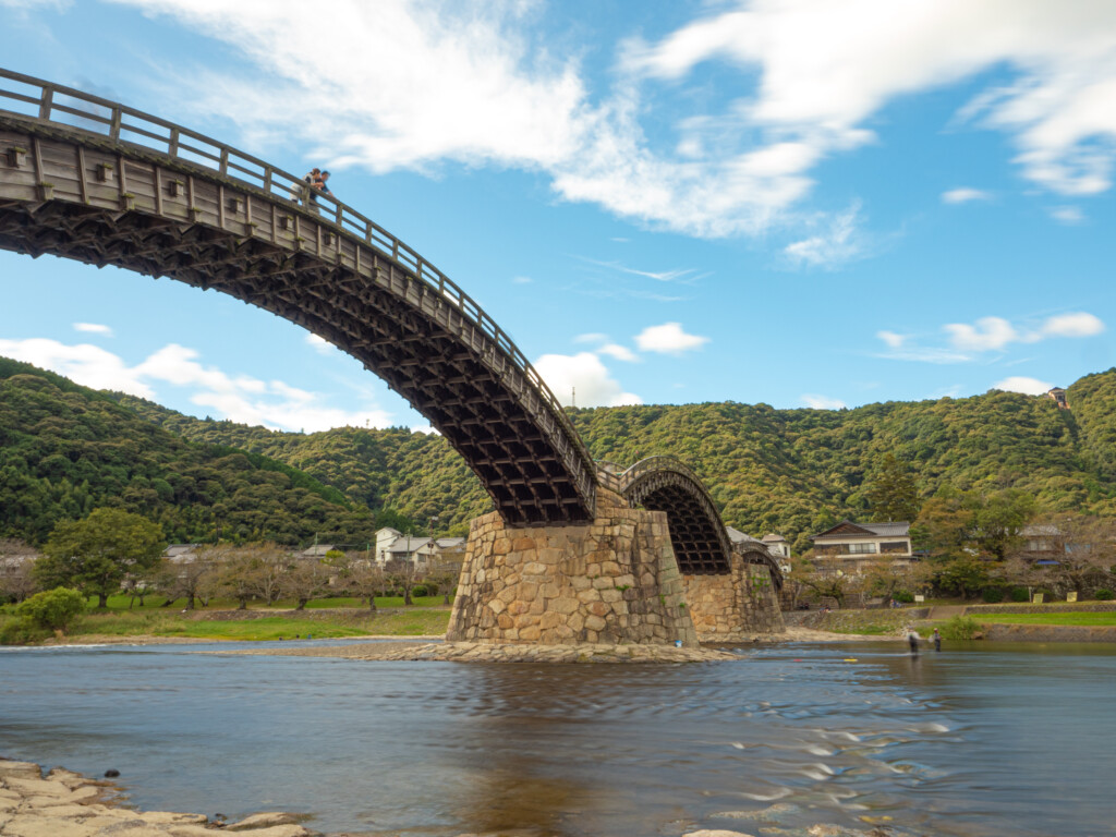 錦帶橋橫跨於山口縣境內的第一大河錦川上,是聞名日本的三大名橋之一,橋身全長約210公尺、寬5公尺、高6.6公尺,1673年建造時,橋身使用木造建材,以繁複組合式工法建造,完全沒有使用任何釘子,預防錦川氾濫,橋身被設計成五座拱門形狀,但因颱風錦川洪水暴漲橋身兩度被沖毀,現在的錦帶橋是2004年以同樣工法再重建的。