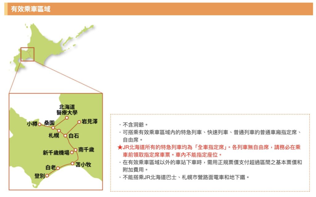 | 適用範圍 | 新千歲機場、札幌、小樽、登別一帶(不含洞爺湖) |