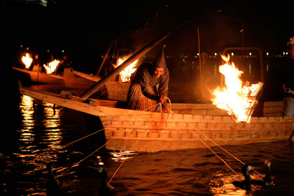 「木曾川的鵜飼」鵜飼是超過1300年歷史的傳統漁法,帶著鸕鶿捕香魚。用吊在船頭鐵筐裡的火把香魚吸引過來,鸕鶿便潛水捕香魚,鵜匠讓鸕鶿把香魚吐出來捕魚。