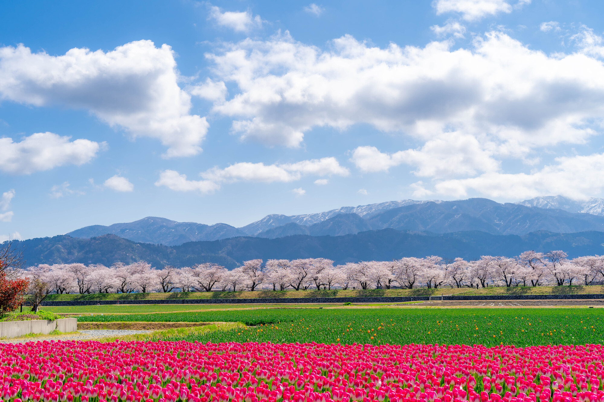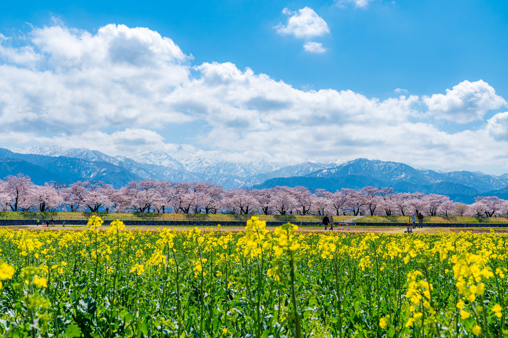 朝日町的春天,景色美不勝收。以北阿爾卑斯山美麗的雪山為背景,遊客在船川河畔欣賞櫻花、鬱金香和油菜花,被譽為美麗的四重奏。每年的櫻花季,當地居民精心培育的280棵染井吉野櫻,會沿著1200公尺長的舟川綻放,讓人感覺像是走在櫻花樹的隧道裡。櫻花盛開時會進行期間限定的點燈,一邊欣賞夜櫻,一邊散步,感受大自然的美麗。