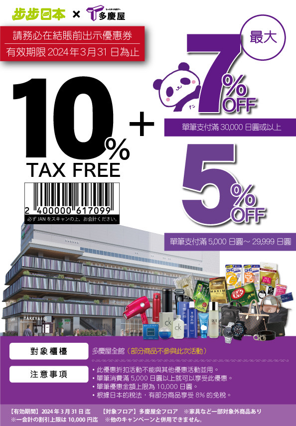 很多觀光客起初以為沒有什麼想買的,結果走進多慶屋以後,就大包小包提回家了(笑)步步日本提供讀者專屬多慶屋優惠券,包括免稅在內還可以再享有折扣,最多可獲得高達的優惠折扣!