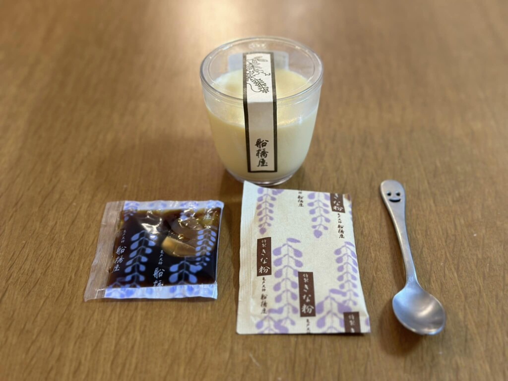 布丁的製作過程,採用了他們家製作葛餅的原料發酵小麥澱粉,名稱取作「船橋屋葛餅布丁」。那天在澀谷SCRAMBLE SQUARE的甜點街看到了,布丁控如我,則能放過呢!立刻下手。