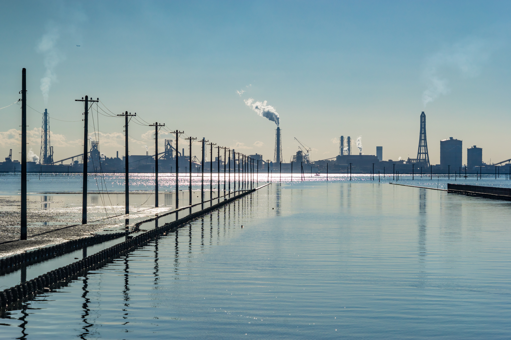 江川海岸因為有許多電線杆矗立在海中,被稱為「海原電線」而聞名。在天氣晴朗、風平浪靜的漲潮時刻,江川海岸的海面猶如一面大鏡子,完美地倒映出天空。