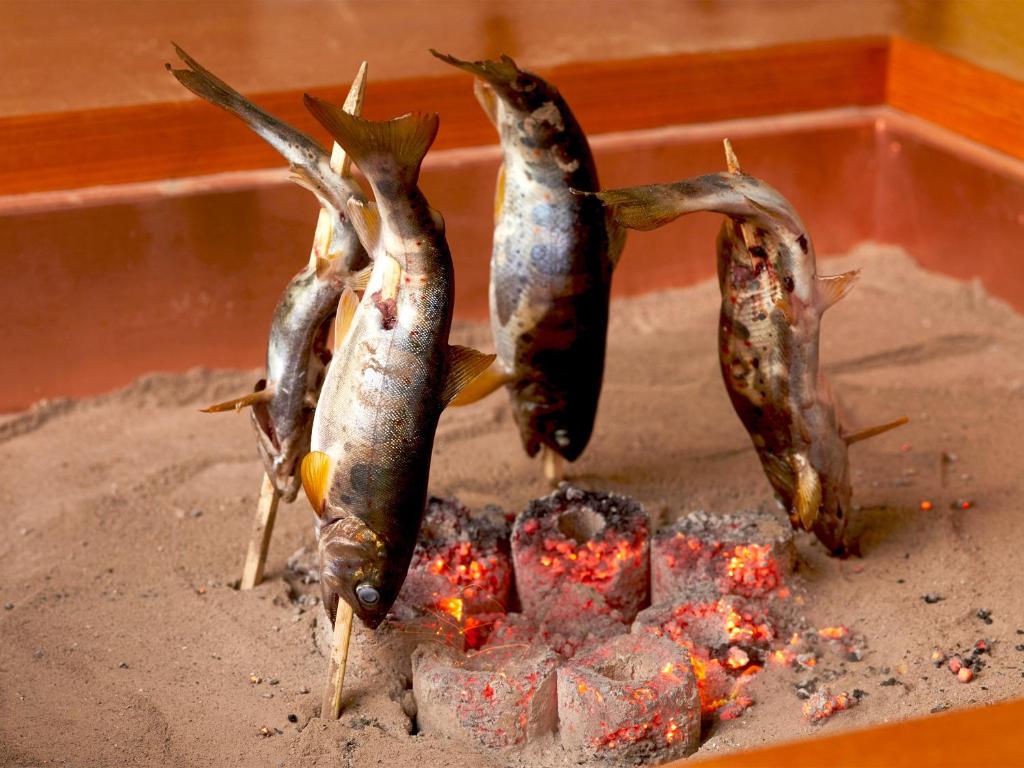 (捕獲的香魚由工作人員立即烹製,可以在爐灶上享用烤魚。)