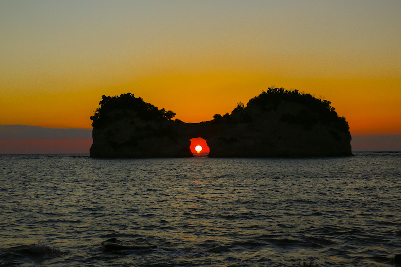象徵和歌山南紀白濱的圓月島,漂浮位於臨海浦南方的海面上,是個南北長130m、東西寬35m、高25m的小島。小島中間的海蝕洞,被稱為圓月島。清澈的海水倒映晚霞,此處的日落被選為「日本夕陽百選」之一,體現了夕陽無限好只是近黃昏。
