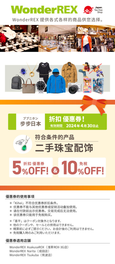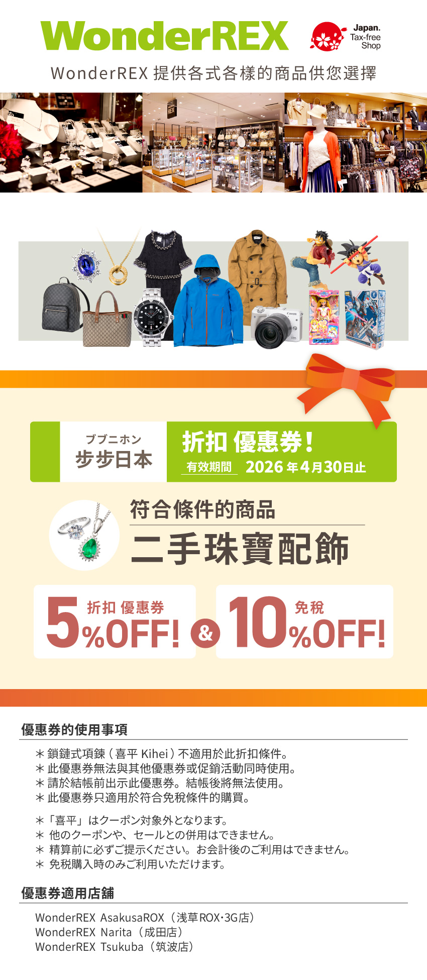 熱愛在二手商品裡尋寶的朋友們,購買中古珠寶飾品的專屬優惠來啦!使用步步日本提供的優惠券,在WonderREX店內商品5%折扣+免稅10%的好康情報,快來收下!