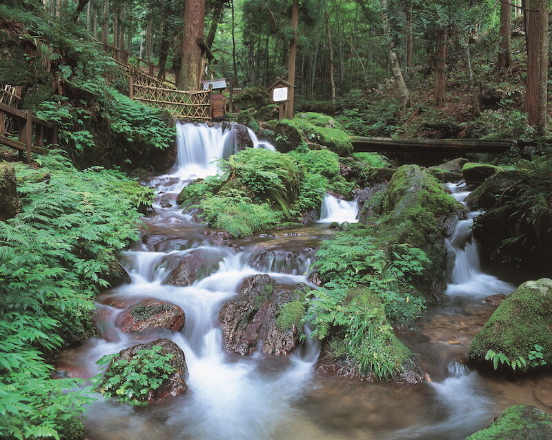 被選為全國名水百選第二名的「瓜割之瀑」,是一個景緻極佳的瀑布景點。瀑布的水非常清涼、強勁,甚至可以將西瓜劃開,因此得名為瓜割之瀑。瓜割之瀑周圍的森林,光線透過樹間灑下,岩石上長滿了苔蘚,形成了幻想般的景色。庭園內種植了一萬株的紫陽花、櫻花、楓樹等,展示了不同季節的風景。