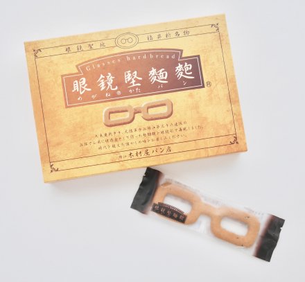 接下來介紹的是越前夢工房的「眼鏡堅麵麭(めがねかたぱん)」這款產品的起源可以追溯到戰時中陸軍的緊急糧食麵麭(かたぱん)福井縣鯖江市的老字號麵包店「ヨーロッパンキムラヤ」負責監修,開發出了這款以眼鏡形狀為特點的「眼鏡堅麵麭(めがねかたぱん)」。福井縣鯖江市以製造眼鏡而聞名,該縣佔據了國內眼鏡框架市場份額的95%。這款獨特的產品展現了福井的特色,由於保存期長且易於分發,兼具趣味與美味的伴手哩,而且還能和朋友們一起擺出戴上眼鏡的姿勢,拍張照片留念!