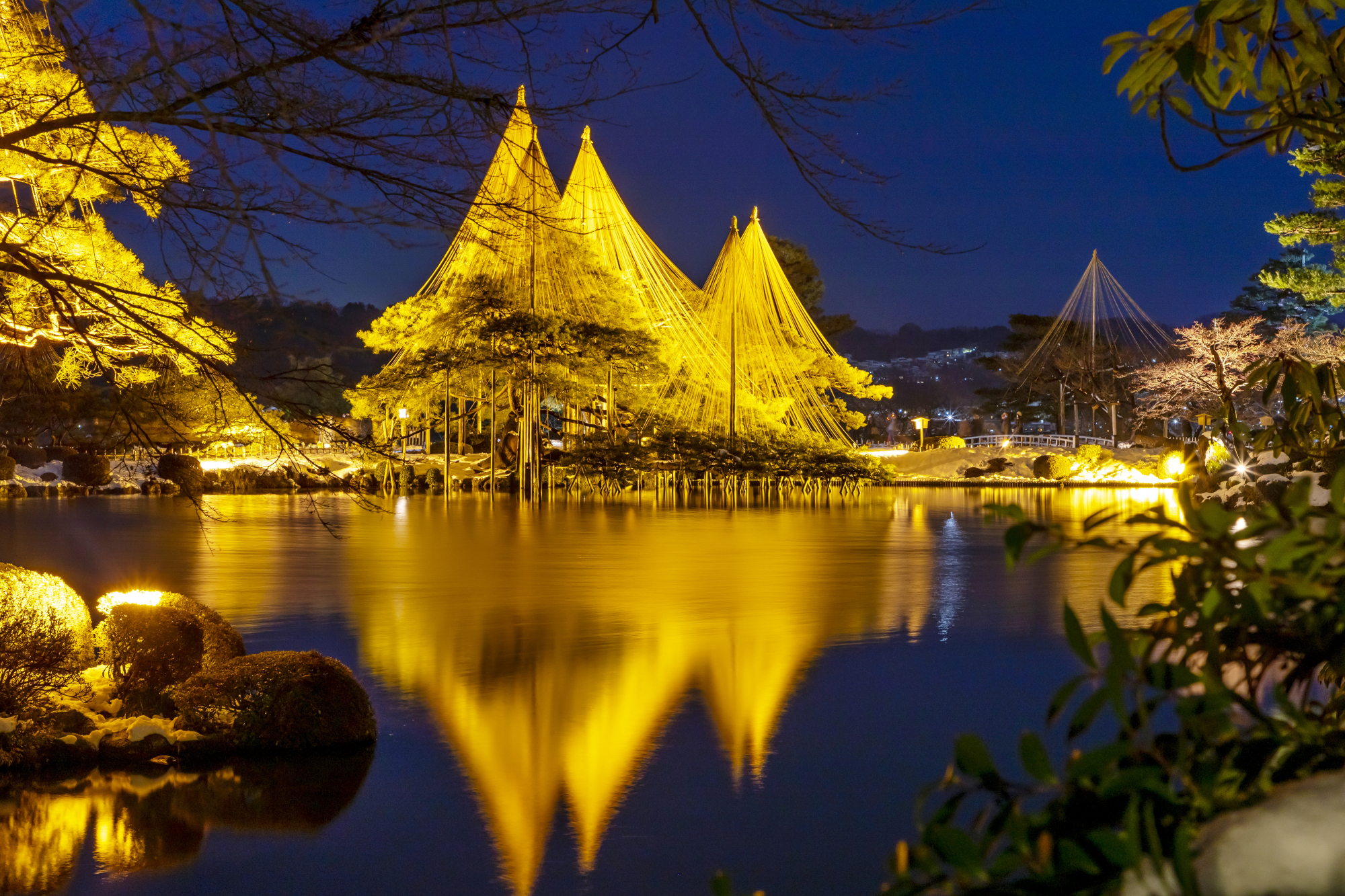 「兼六園」是日本三名園之一!你能在這個金澤市景點享受到四季豐富的自然美景,「兼六園」同時也被指定為國家特別名勝,「兼六園」廣大的園區內分佈著人工山丘、池塘和茶室等,成為一個可以欣賞不同景觀的遊覽庭園。你可以在四季間享受各種自然美景,特別是冬天的「雪吊り」,這是保護樹枝免受雪的重壓的金澤冬季風景,絕對值得一看。在夜間的照明下,庭園被幻想般地彩繪起來,如果來訪金澤市,一定要安排一趟夜間的行程來訪「兼六園」。