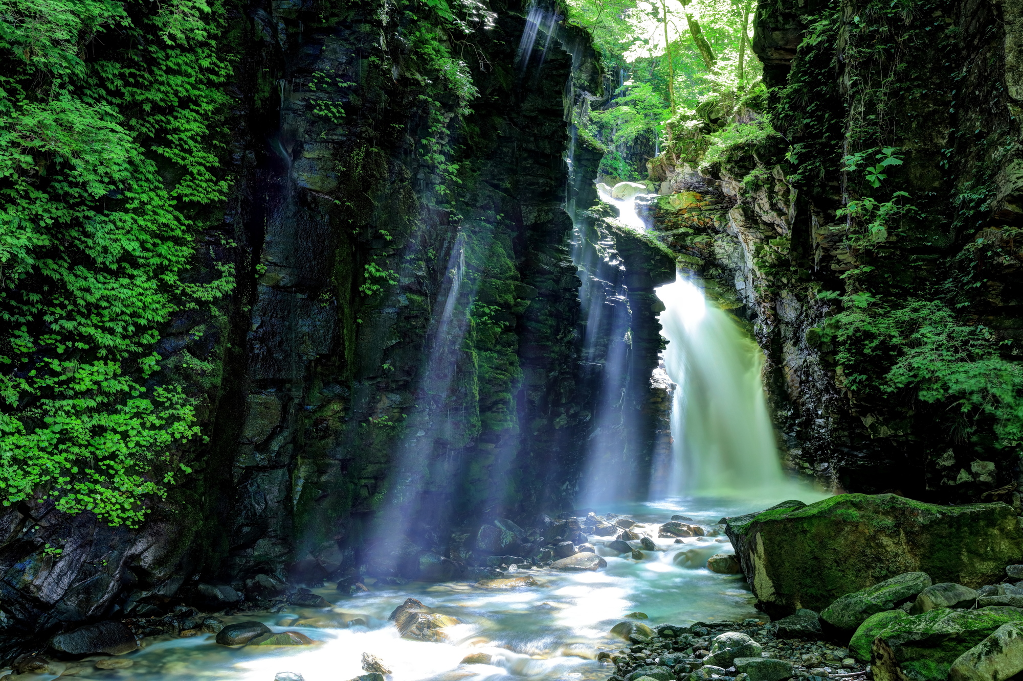 Sukkan澤地,位於那須塩原市的一個神秘而美麗的溪谷,以其湛藍的水和獨特的光線效果而聞名。這裡的水質含有豐富的礦物質和碳酸等火山岩成分,所以當陽光照射時會散發出藍白色的光芒,被稱為「Sukkan Blue」。在這個迷人的溪谷中,您可以找到多個欣賞清流的景點,並且有一條遊步道供遊客遊覽,這條步道的距離和時間都非常適中,使人可以輕鬆地沿著溪谷漫步。其中最著名的景點之一是「雄飛的瀑布」。在下午2點至3點左右,瀑布將迎接陽光的照射,展現其最壯麗的姿態。這個神秘而壯觀的景象吸引了眾多攝影愛好者前來捕捉。