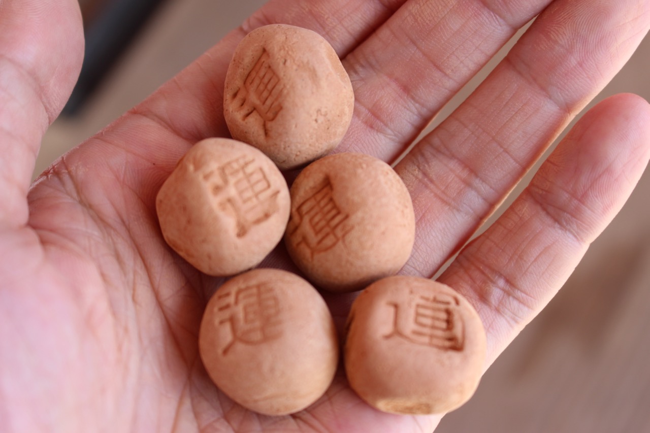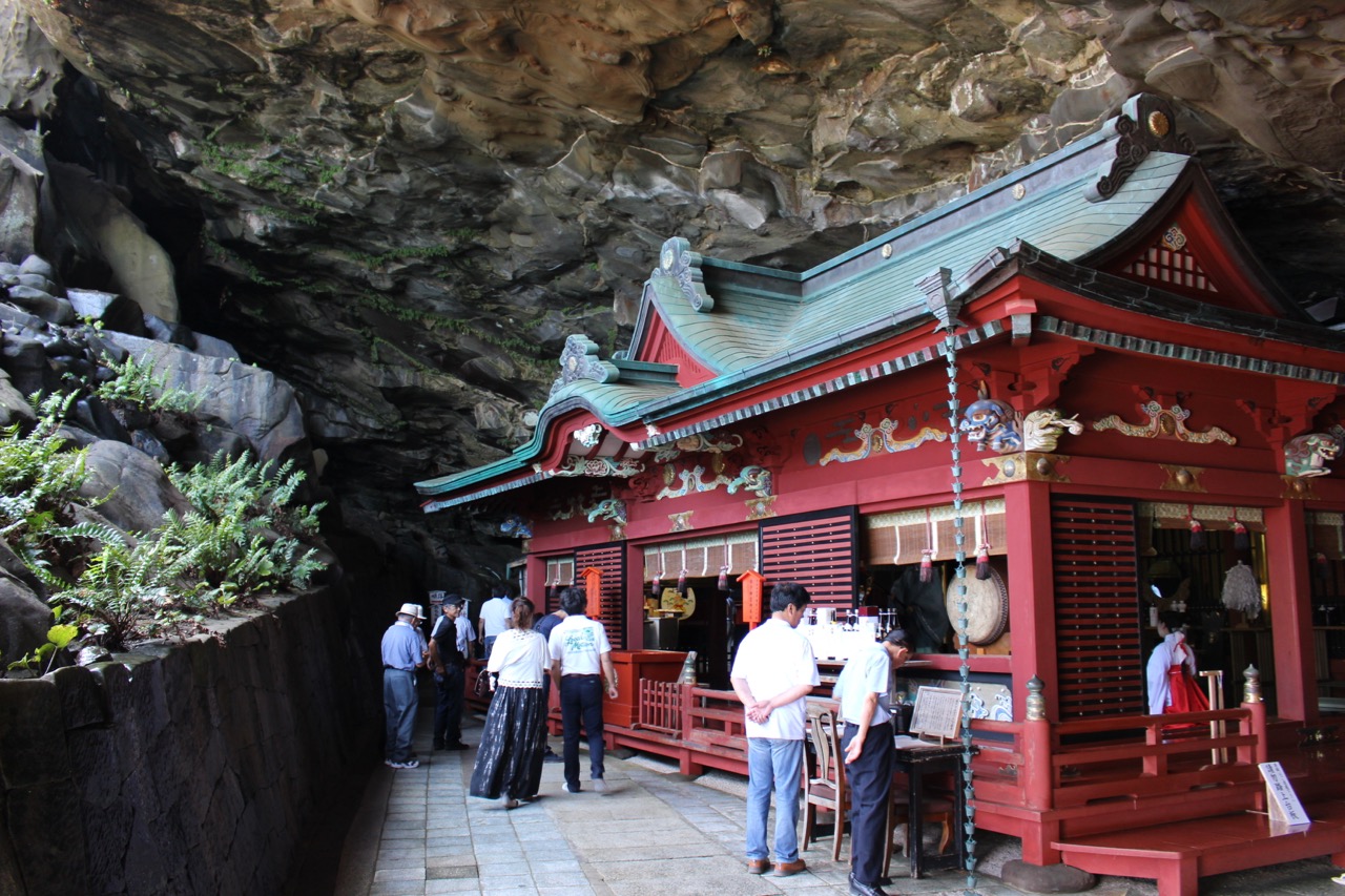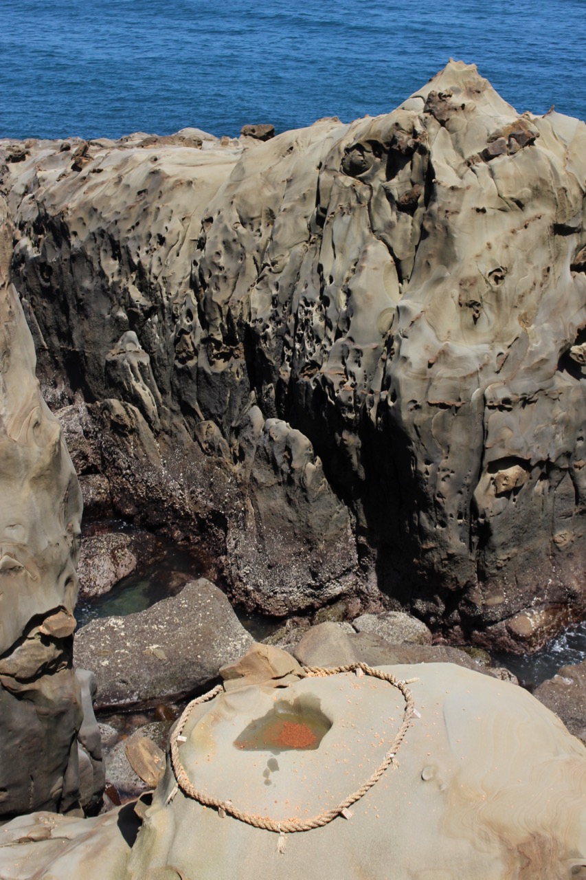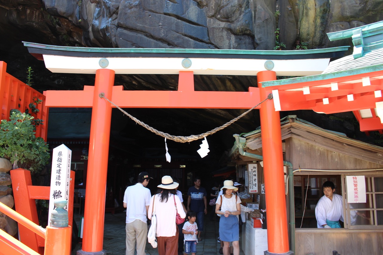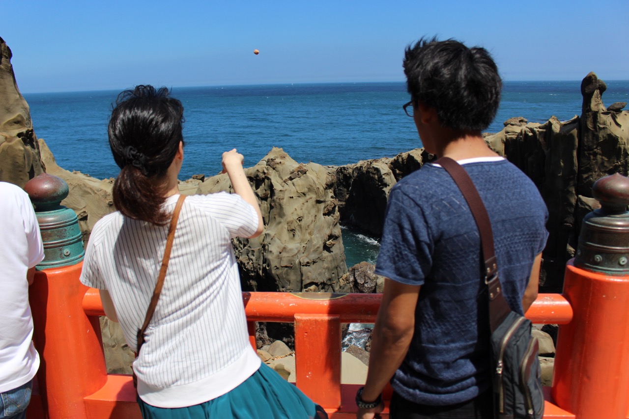 拜完洞窟裡的眾家神明以後,走出鳥居前,在販售御守的地方,別忘記買一份「開運豆」試試運氣。拿著一次五粒的陶製開運豆,走到鳥居外的懸崖邊,會望見海水侵蝕的石塊之間,有一處用結繩圍起的小小許願池。男生用左手,女生用右手,若能精準地將開運豆拋進許願池中,據說就能實現願望。許願池範圍很小,又有好一大段距離,要投進,還真非易事。