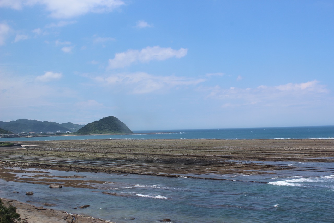 青島神社在日南海岸上延伸出去的一個小島,圓周長度只有一.五km。抵達神社,必須先穿越一條由碎貝殼跟石階交織而成的河床,而這條路,就像是海上的參道,通向神的境界。