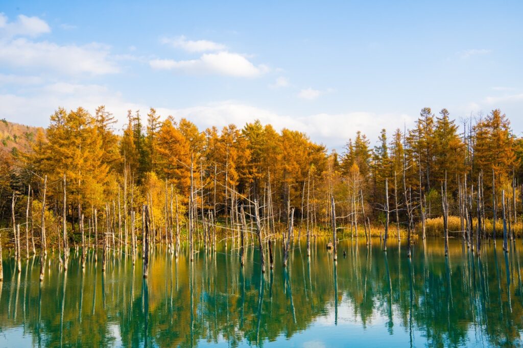 北海道美瑛的白金青池,是北海道眾所皆知的絕景,一年四季有不一樣的景致,特別是秋天,山上的樹木染上一整片的金黃與燦紅,鮮豔的色澤映照在藍色絕美的湖面上,美得讓人屏息震撼,尤其推薦早晨來青池賞楓,可以看見宛如仙境般清澈、純淨的美景。