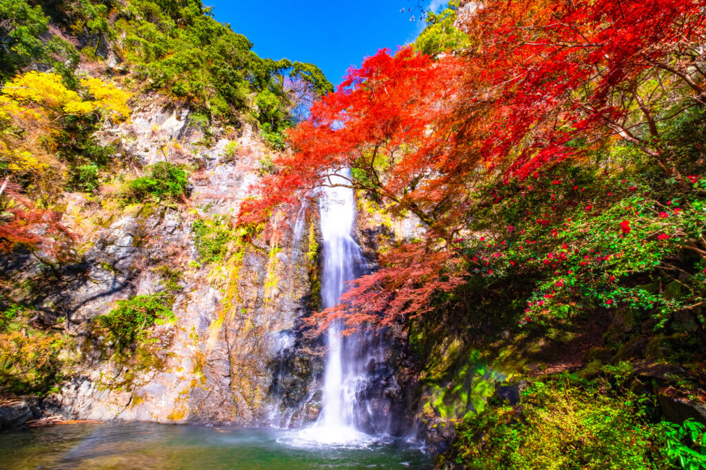 箕面山與周邊一帶於1967 年被指定為現今的箕面國定公園,為海拔約100 至600 公尺的自然山區,是大阪市區交通便利的賞楓公園,沿著步道可以走到公園裡的熱門景點箕面瀑布,氣勢壯闊的箕面瀑布是日本百大瀑布之一,在秋天更是許多人會來朝聖的景點,而箕面必吃名產「紅葉天婦羅」,將楓葉醃製一段時間後油炸而成,香濃酥脆,一定要嚐嚐。