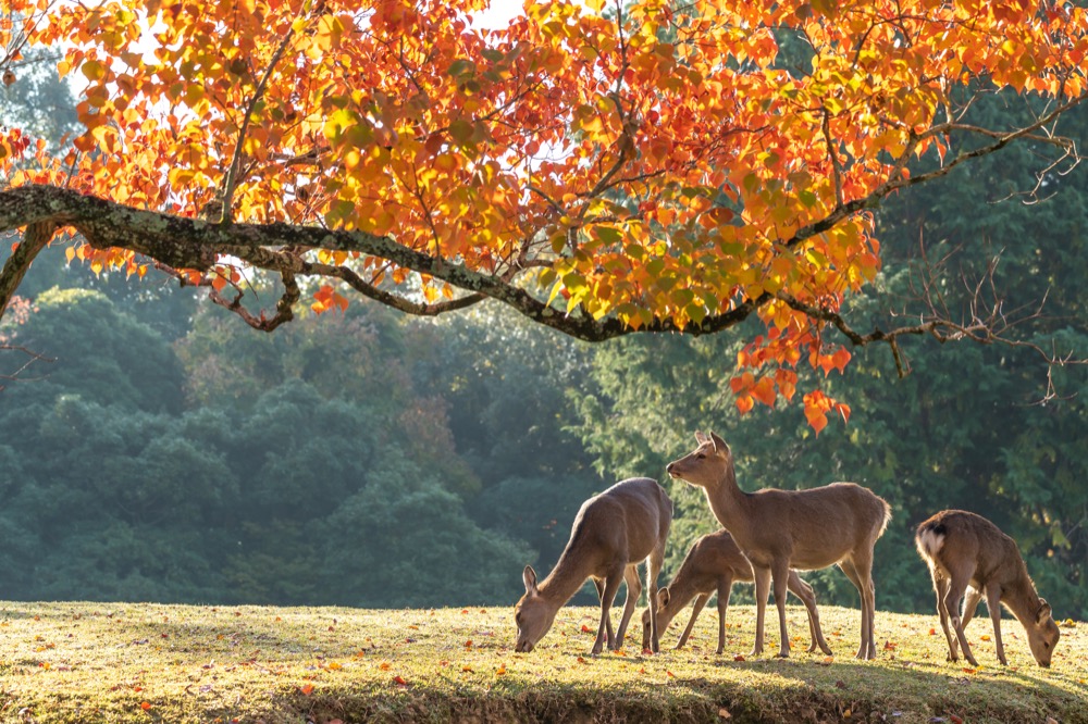 關西的紅葉勝地還有「大阪城公園」,登上天守閣俯瞰被楓紅染色的街景,感受豐臣秀吉當年的意氣風發。「奈良公園」除了可以餵食小鹿,還可以觀賞到小鹿們在銀杏絨毯上散步,真的超級可愛!