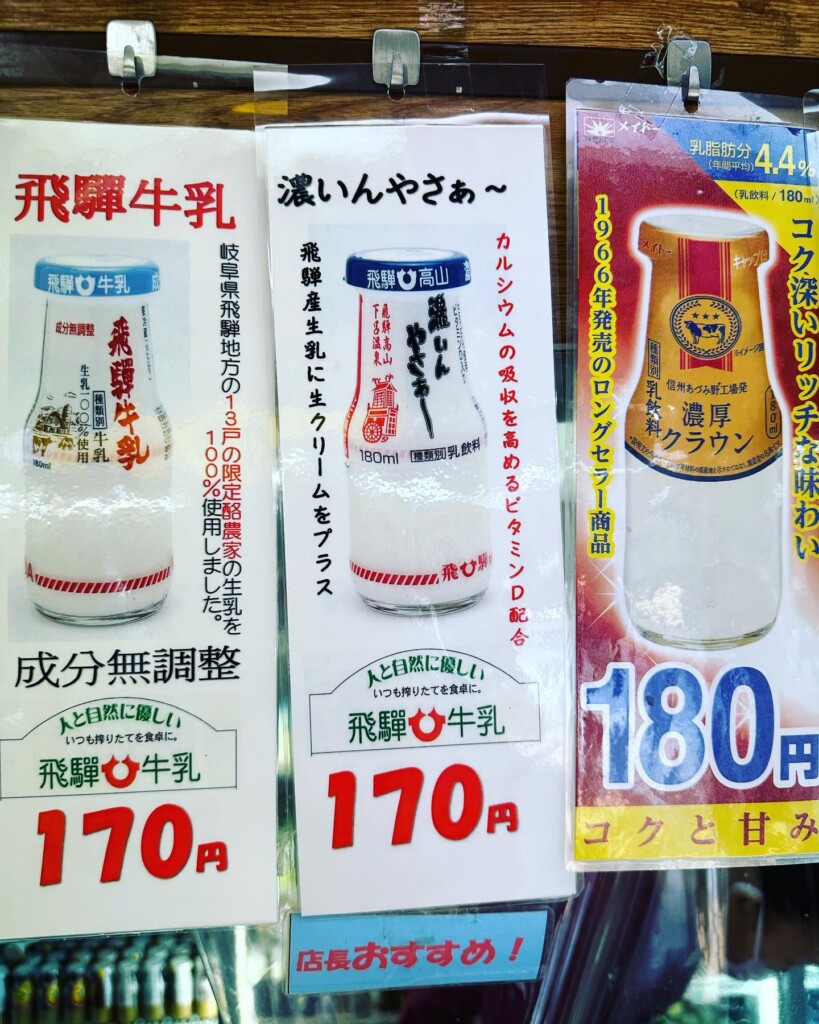 嗯,今天該喝哪一種呢?店頭貼了一整排的產品名稱,來自日本各地的知名牛乳或調味乳,琳瑯滿目,讓有選擇困難症的人總會陷入沈思。