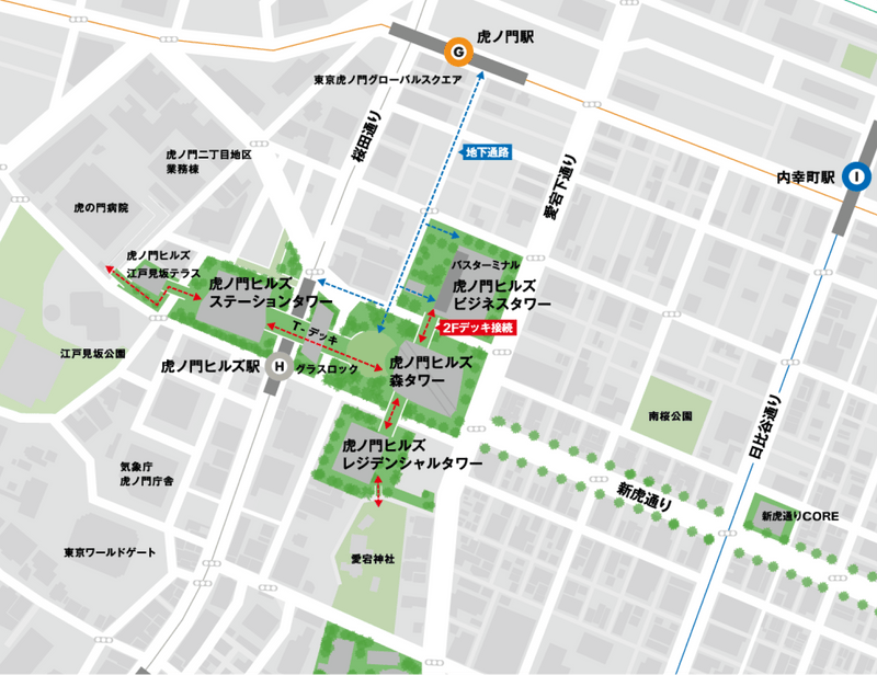 2023年10月6日最新落成的「虎之門之丘車站大樓」正式開業,進一步增設了開敞的車站前廣場「車站中庭」,以及橫跨櫻田通的寬20公尺的大型行人天橋「T-DECK」(T-天橋),創造了整個區域的流動性和熱鬧氛圍。