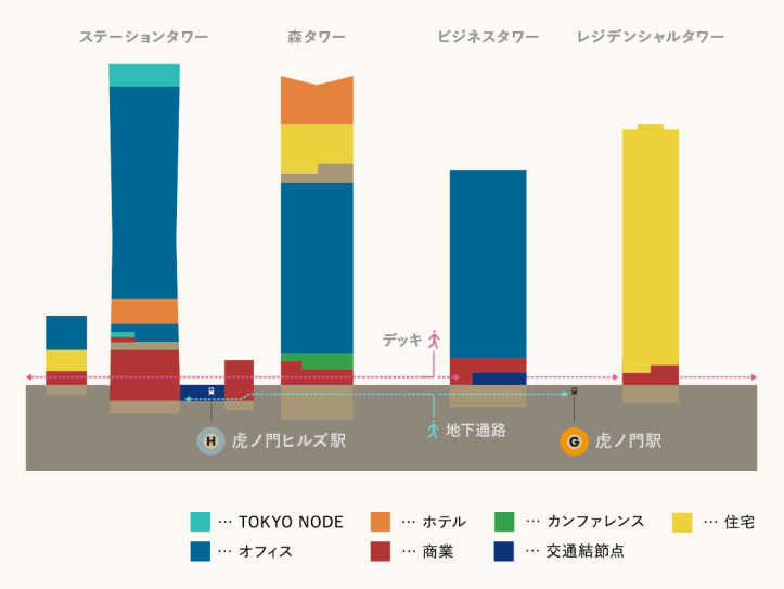 虎之門之丘(Toranomon Hills)於2014年誕生,以「虎之門之丘 森大樓」為起點,逐步擴展並演進,包括「虎之門之丘 商業大樓(2020年完工)」和「虎之門之丘 住宅大樓(2022年完工)」等,同時與環狀第二號線、獨立行政法人都市再生機構以及東京地下鐵株式會社所推動的東京地鐵日比谷線「虎之門之丘站」等交通基礎設施進行緊密整合。