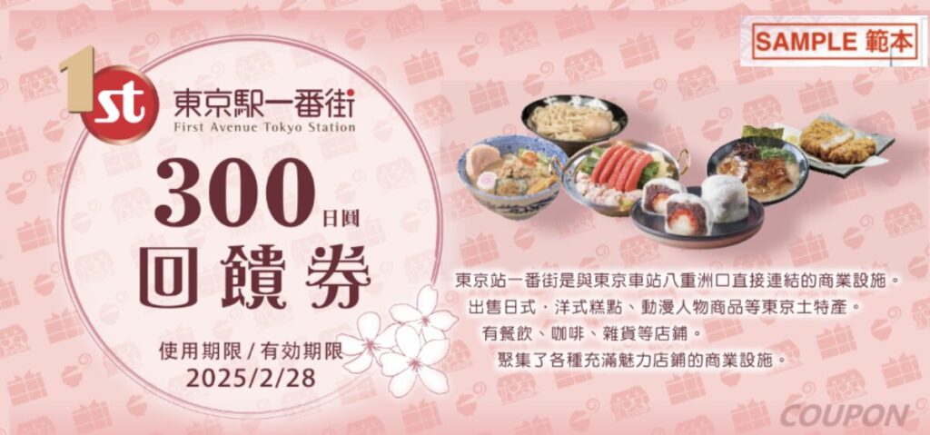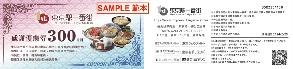 請注意!圖片為優惠券範例,無法直接使用。只有在台北國際旅展拿到的實體優惠券,才能夠至東京站一番街使用。