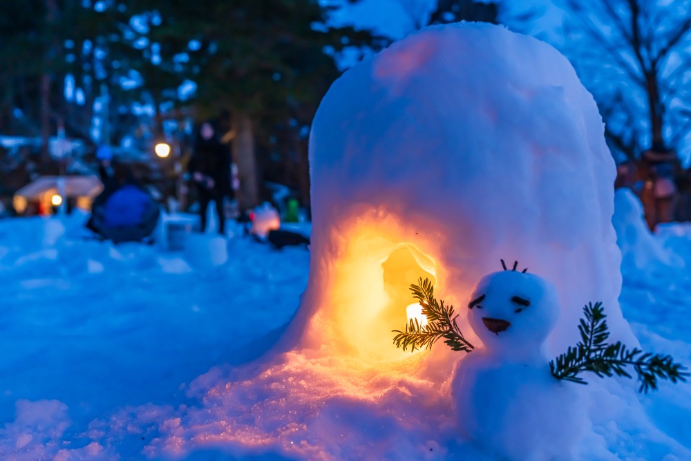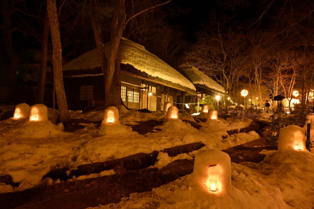 秋田縣橫手市的「橫手雪祭(横手の雪まつり)」是擁有450年傳統的水神祭典,每年2月舉行。在祭典期間,數十多座美麗的「雪屋(かまくら)」,或稱「雪洞」,會點起溫暖的燈光,營造浪漫的夜晚氛圍。進入雪屋,可以品味當地居民款待的甘酒和麻糬,同時祈求神明的祝福。