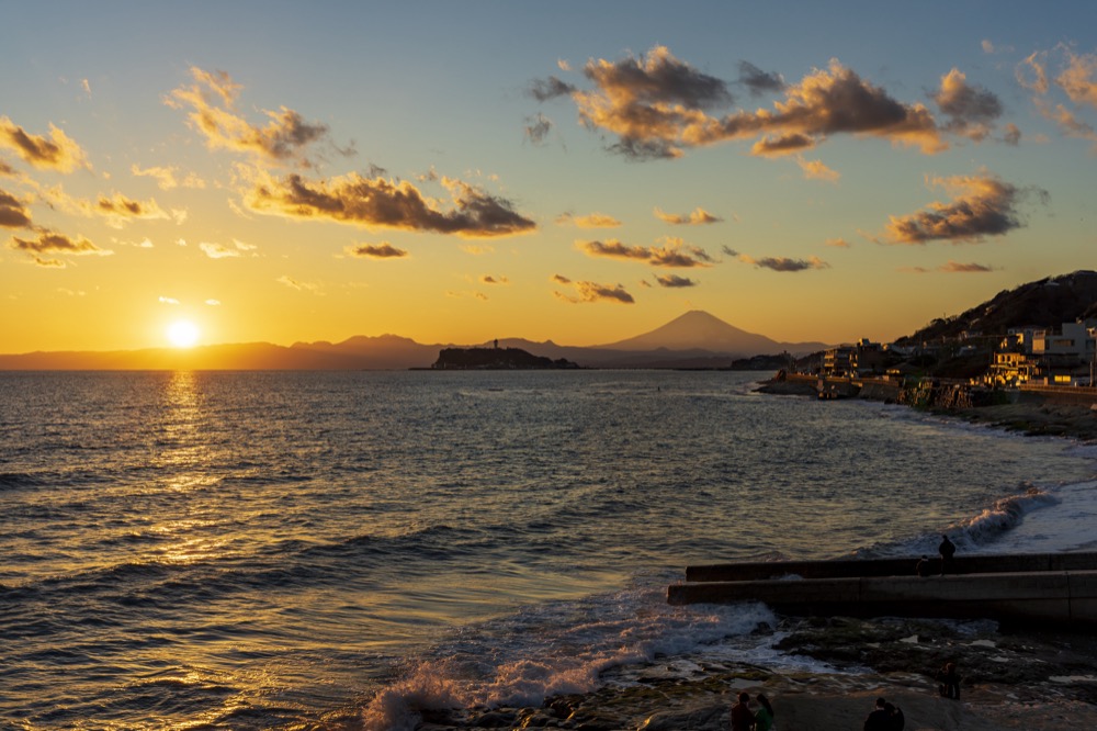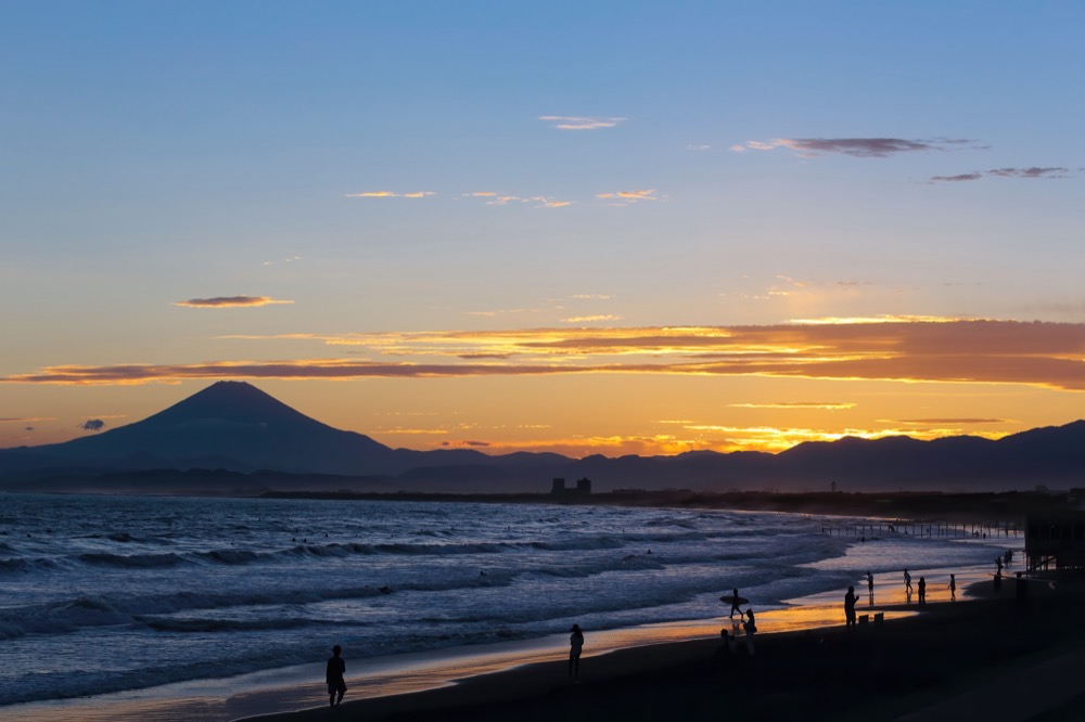 不僅如此,片瀨海岸更被譽為「日本海水浴場55選」之一!在晴朗的好天氣,不僅可以同時眺望著江之島、三浦半島和壯麗的富士山,更可以在海浪波音的環繞之中,盡情享受海水浴。而到了傍晚的夕陽西下時刻,江之島剪影的美景,以及被落日染成橘紅色的富士山,夢幻的景色絕對讓人如癡如醉。