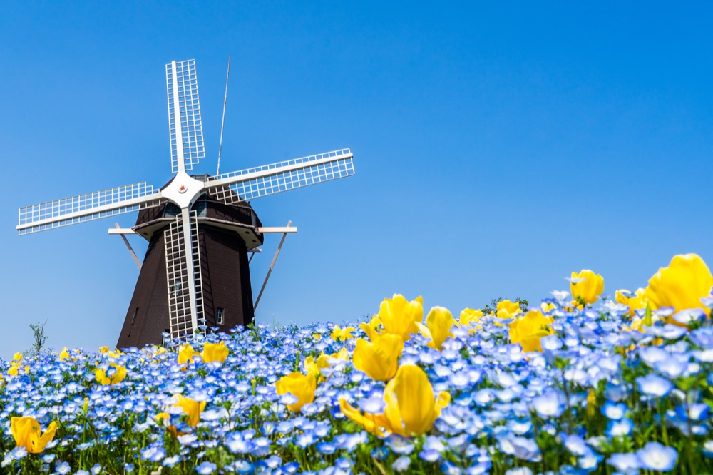 在春季,有粉色櫻花、寶藍粉蝶花、深粉芝櫻、多彩鬱金香、嬌嫩玫瑰花爭相綻放,秋天還有可愛的大波斯菊!不僅是欣賞自然的好去處,園區中還有異國風格的建築物,如荷蘭風情的「風車の丘」等,如同一場視覺的異國旅行。