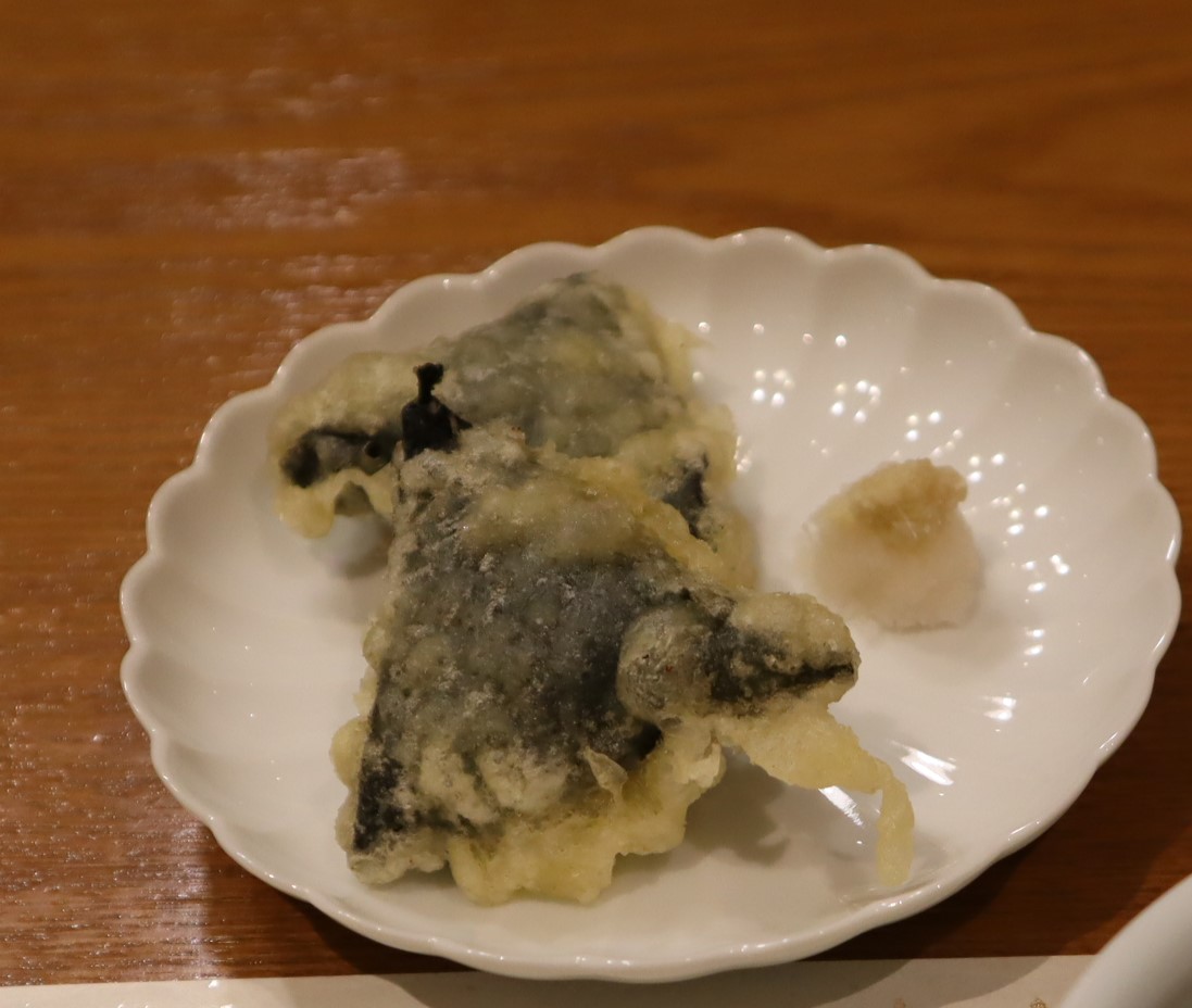 以海苔包裹之後再油炸的文蛤天婦羅,除了新鮮文蛤的鮮美之外還多了一股淡淡的海藻香。