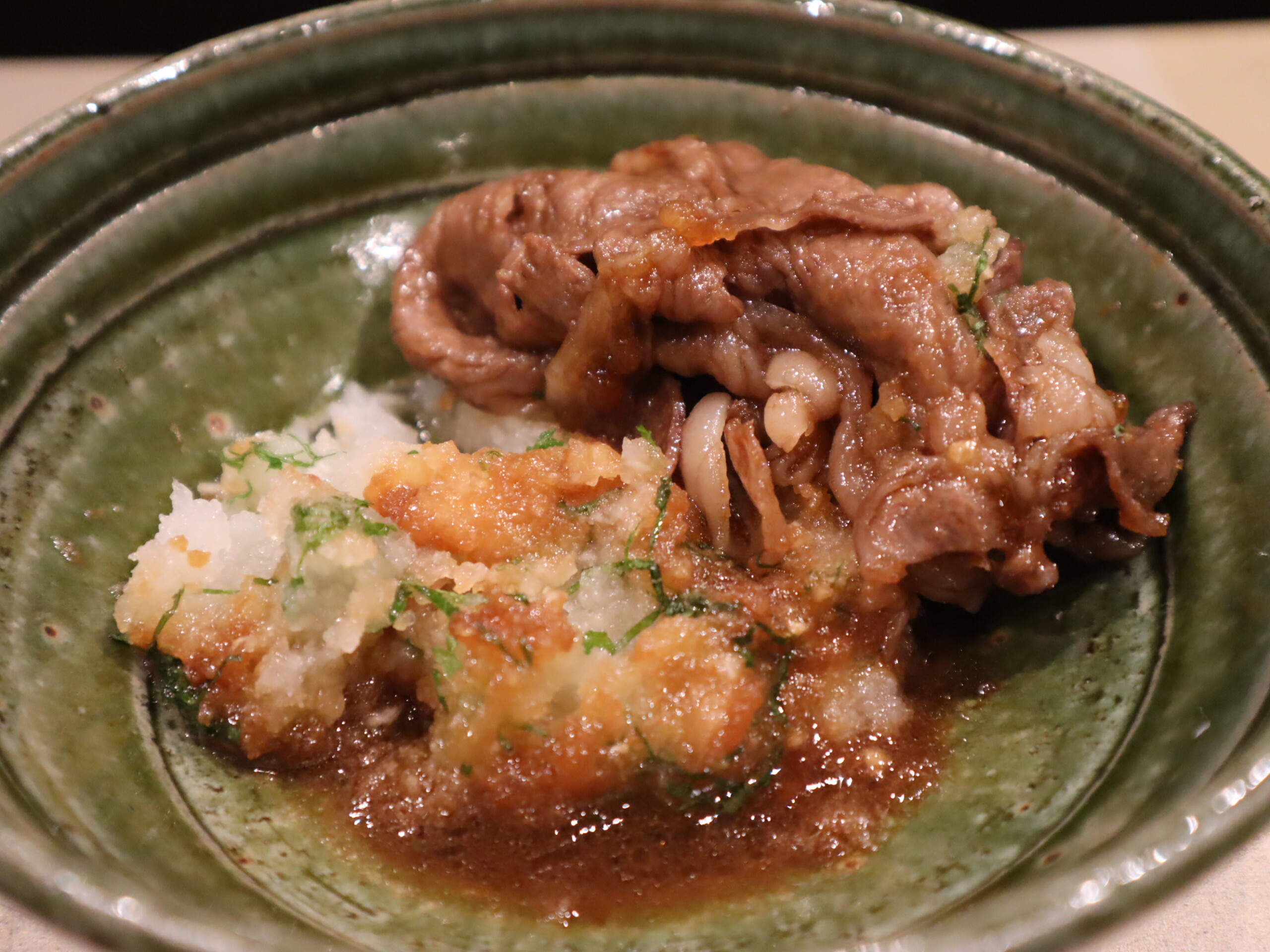 「柿安 料亭本店」的壽喜燒除了一般沾蛋汁的吃法之外,還提供給雞蛋過敏的客人搭配蘿蔔泥的吃法。不管是香濃的蛋汁或是清爽的蘿蔔泥與柿安的牛肉都是令人口齒留香的完美組合。