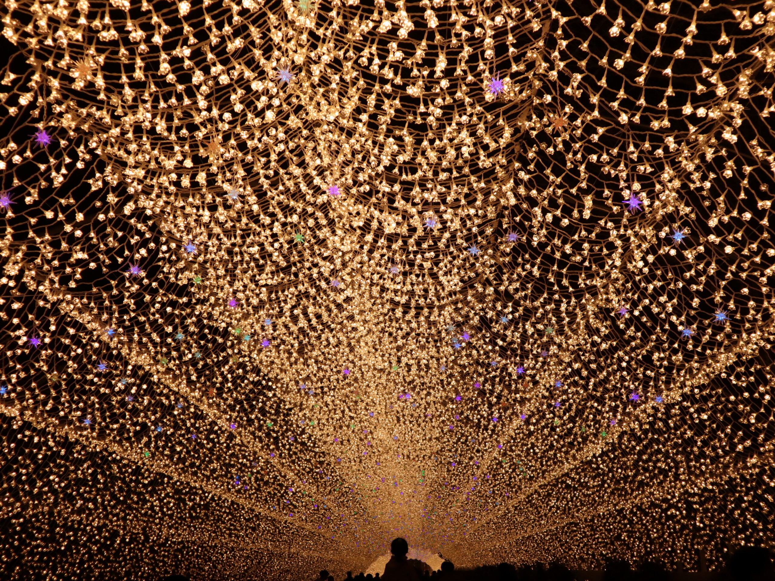 白天在花海中散步之後可別急著離開,尤其是每年10月底到隔年6月期間,一定得留下來欣賞日本國內最大規模的燈光秀。除了兩段相連共長達300公尺的光之隧道以外,閃亮的燈河與每次不同主題搭配音樂的燈海秀更是令人著迷。2023年燈海的主題是黃金金字塔,漆黑的夜空下環繞耳邊的是充滿神秘感的音樂,映入眼簾的是變化無窮的燈光,呈現出與白晝截然不同的異世界。現場不論男女老少都沉醉在這美麗的夜色之中久久無法離開。