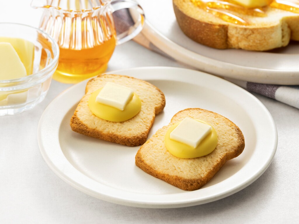 外觀就像加了蜂蜜的牛油烤麵包,這款可愛的「蜂蜜吐司酥餅」。在仿造麵包外形的牛油香酥餅上,堆著柔滑的蜂蜜巧克力和豐富的牛油巧克力。
